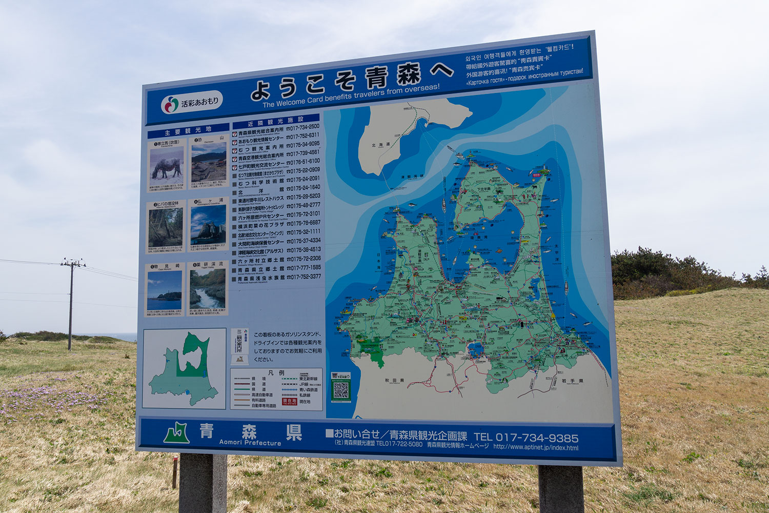 灯台の手前にあった広めの駐車場に停めて、徒歩で灯台周辺を散策することに。駐車場にあった観光案内看板。対岸の北海道は別として、改めて青森は大きいです。