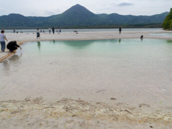 ぐるりと巡って、宇曽利湖畔の極楽浜。青く輝く水面と白い砂浜がこれまでの風景と異なり天国にたどり着いたかのような景色。積み石に立てられた風車がクルクルとまわっていました。