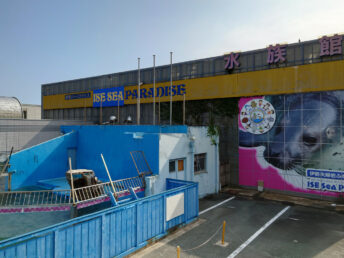 駐車スペースの道路を挟んで向かい側。商業施設「伊勢夫婦岩ショッピングプラザ」と小さな水族館「伊勢シーパラダイス」があり、海の生き物の鳴き声がどこからともなく聞こえてきます。時間は9時過ぎ、オープンしたてで人もまばらな館内を通り抜けて、海沿いをてくてく、鳥居が見えてきました。