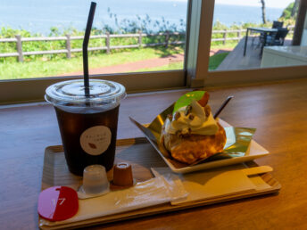灯台を後にし、空調の効いた休憩舎へ。建物内はカフェスペースになっており、お茶などの飲み物のほか、お芋スイーツが提供されています。そろそろ昼食の時間ですが、アイスコーヒーと数量限定のスイーツでティータイム。海を眺めながらひと休みできました。