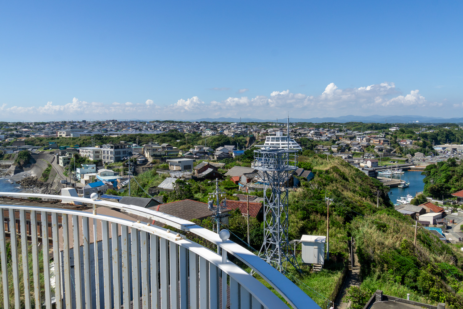 灯台からは港町が一望でき、太平洋に近いため大小さまざまな船が行き来し、安乗﨑灯台とはまた違った景色を楽しめます。吹き抜ける風が涼しい付属舎では灯台を擬人化したキャラクターが笑顔?で出迎えてくれました。