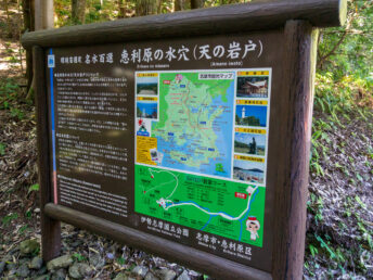 天の岩戸(恵利原の水穴)は古事記に記される神話、天照大神が須佐之男命を戒めるために岩戸に隠れてしまう伝説の洞窟で、伝説の地は日本各地にあるようです。看板によると、ここから先は徒歩となるようです。周辺の観光案内に並んで、散策コースの紹介があり、岩戸までは片道400mほどあるようです。すべてを巡ると1時間以上要しそうな距離。先を考えると時間的に危ういので、名水百選にも選定されている、脇を流れる神路川のせせらぎを観賞して元来た道を戻ることにしました。